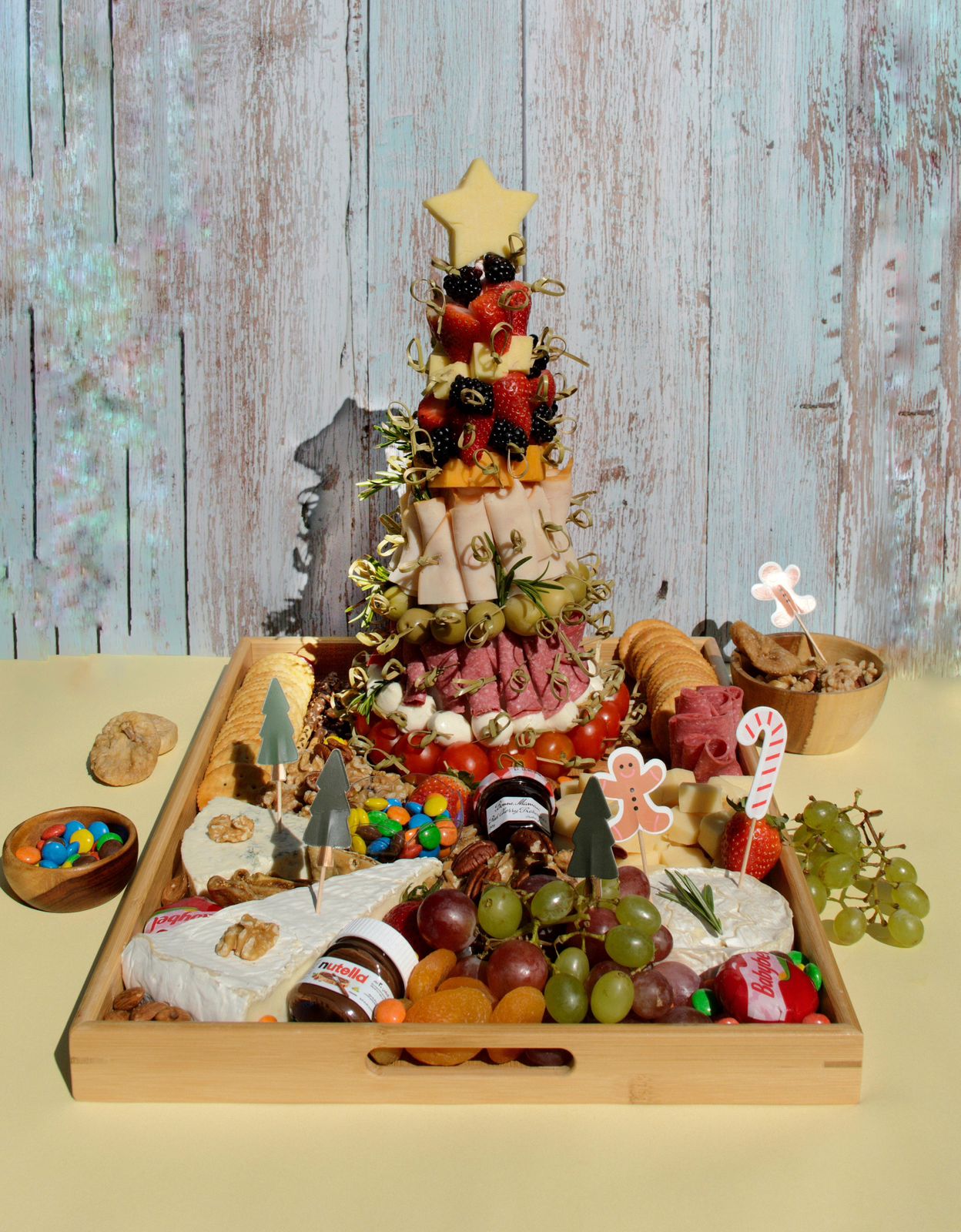 A Tree of cheese (mozzarella, cheddar), cold cuts (Pepperoni & Chicken), olives and fruits in the middle of a cheese board.